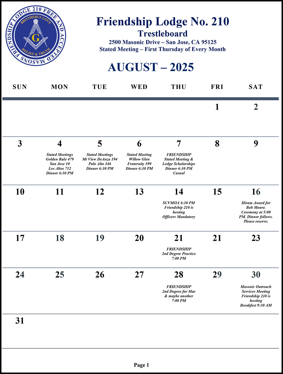 © 2019-26 Friendship Lodge No. 210 | Free and Accepted Masons of the State of California. Design: Melody Sharp