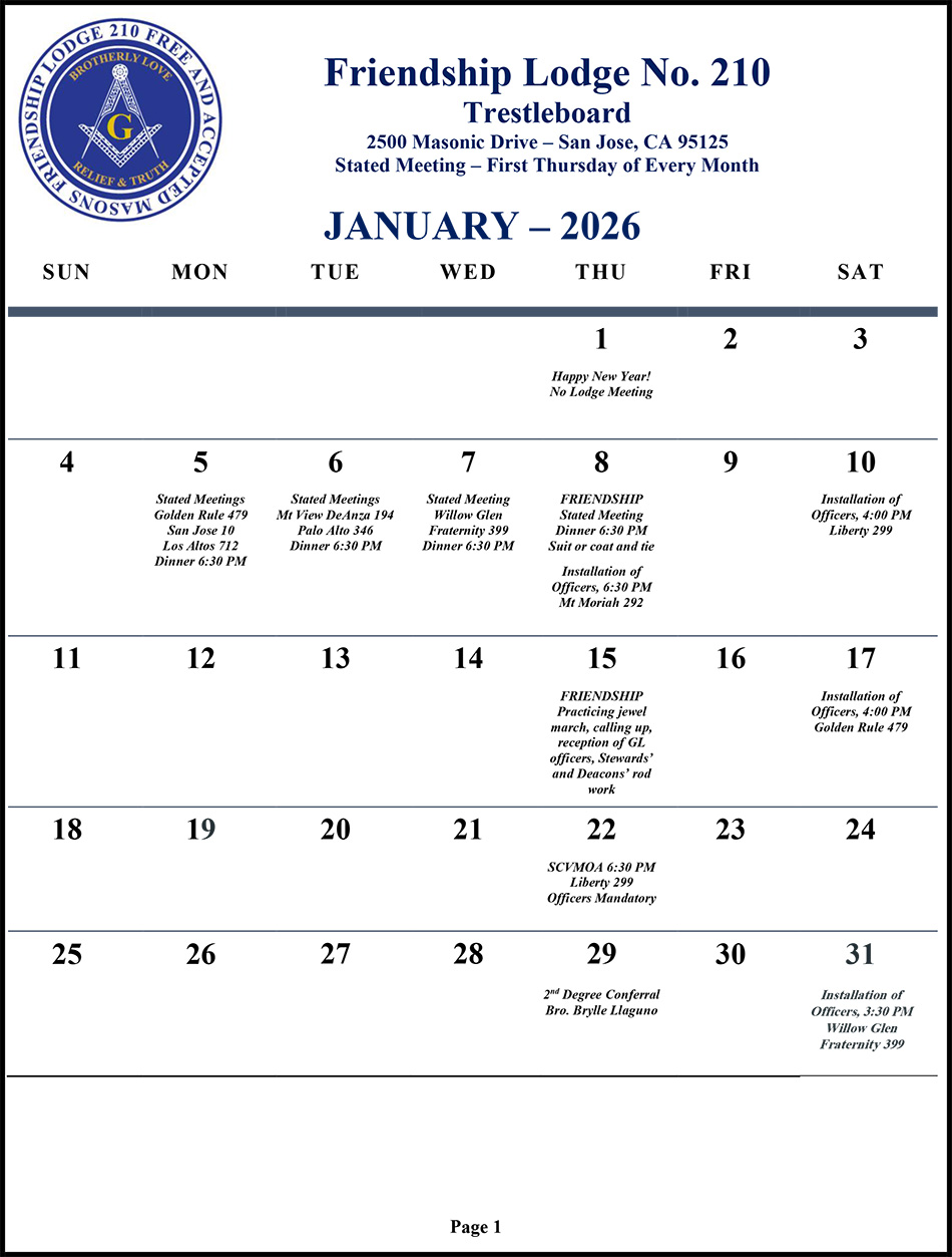 © 2019-26 Friendship Lodge No. 210 | Free and Accepted Masons of the State of California. Design: Melody Sharp