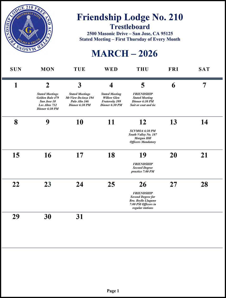 © 2019-26 Friendship Lodge No. 210 | Free and Accepted Masons of the State of California. Design: Melody Sharp
